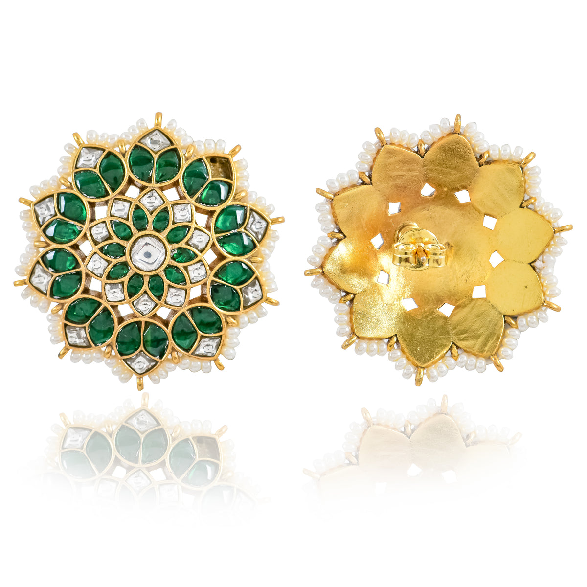 The Sanaar Gold 925 Sterling Silver Green Kundan Floral Stud Earrings are a blend of traditional elegance and timeless charm. Designed in a delicate flower shape, each petal is adorned with rich green kundan stones, reflecting freshness, prosperity, and sophistication.