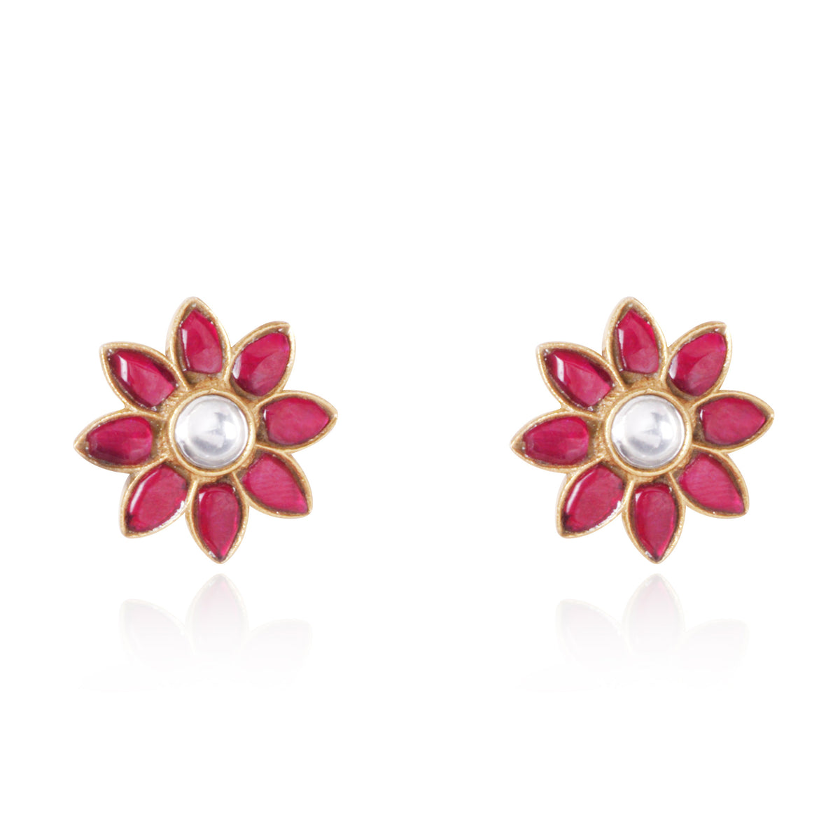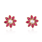 The Sanaar Gold 925 Sterling Silver Pink Kundan Floral Stud Earrings blend traditional artistry with modern charm. Each earring showcases delicate petal-shaped pink kundan stones arranged in a floral pattern, highlighted by a brilliant white kundan at the center. Crafted in hallmarked sterling silver with premium gold plating, these studs promise both elegance and long-lasting shine.